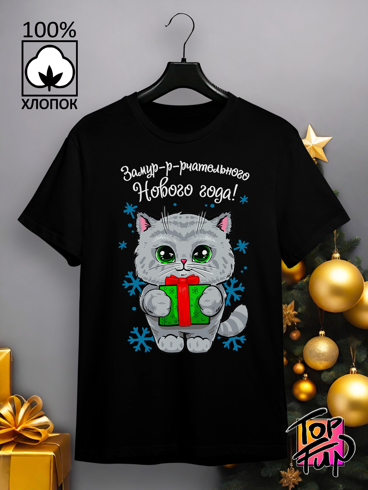 Хлопковая футболка женская новогодняя с принтом Котик замурчательного года