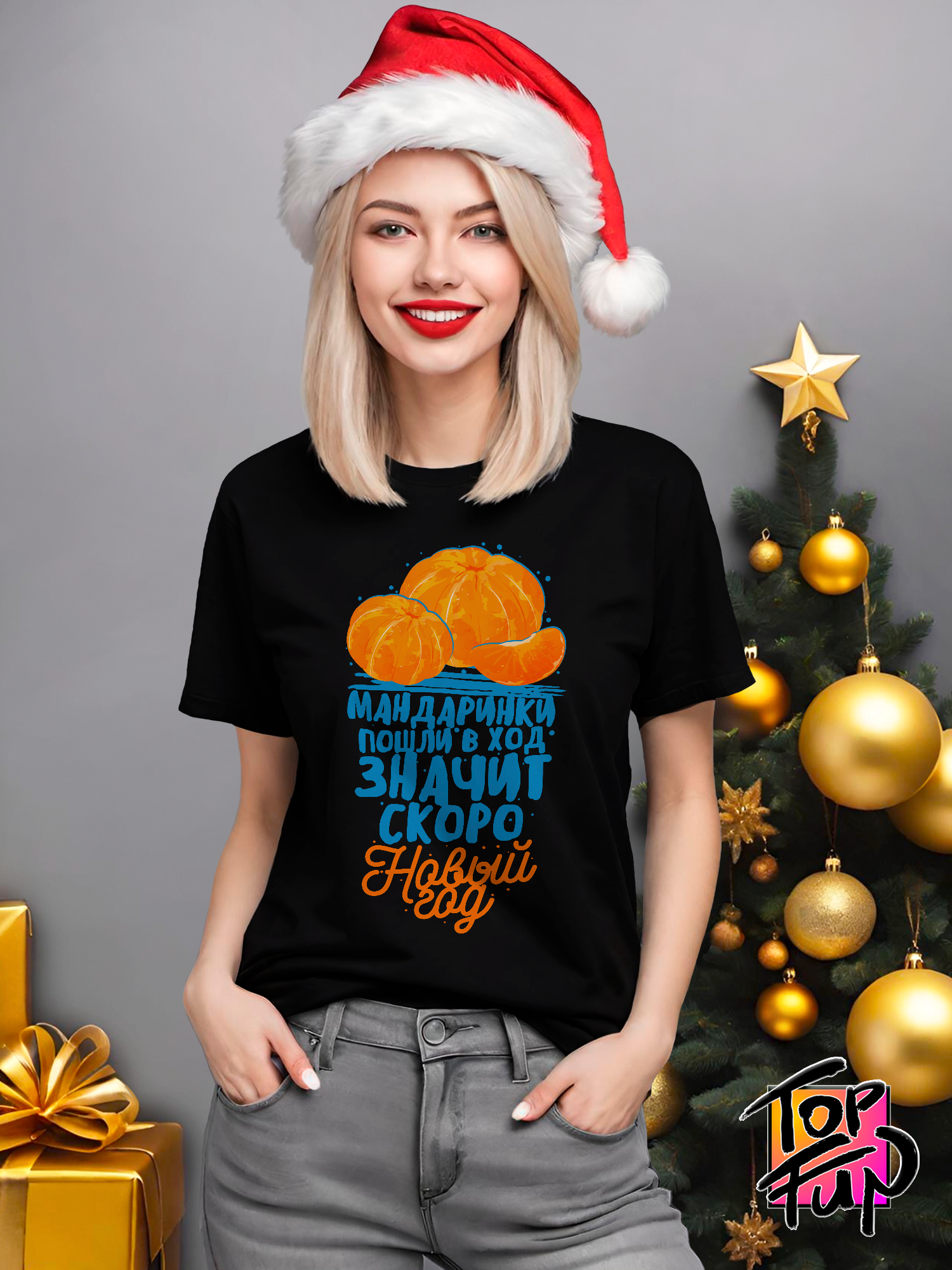 Хлопковая футболка женская новогодняя с принтом Мандаринки Новый год