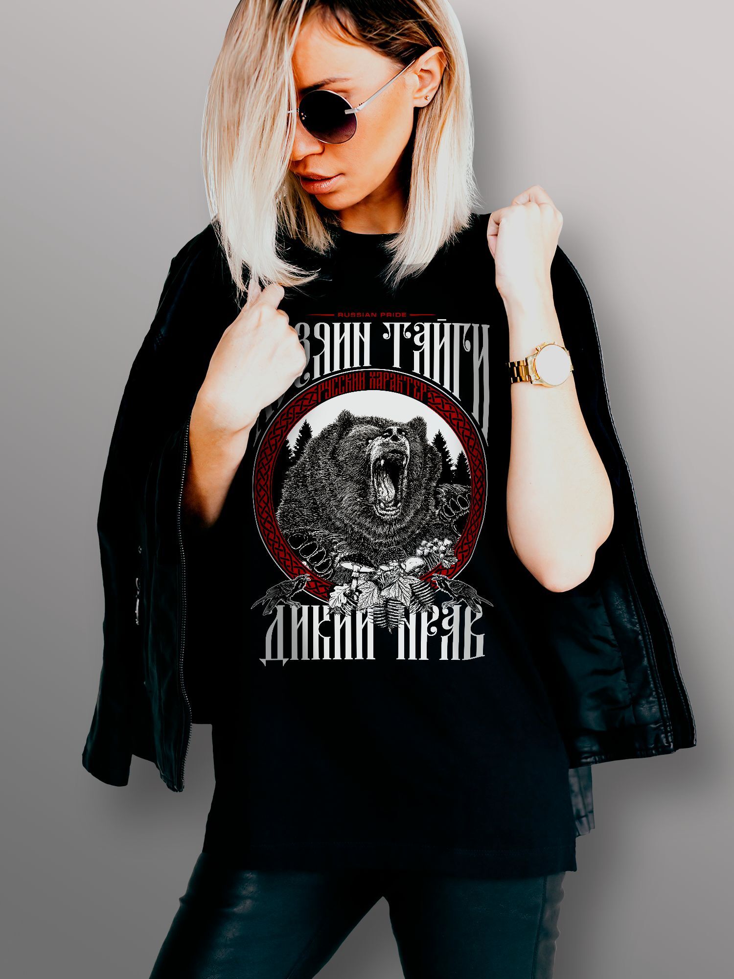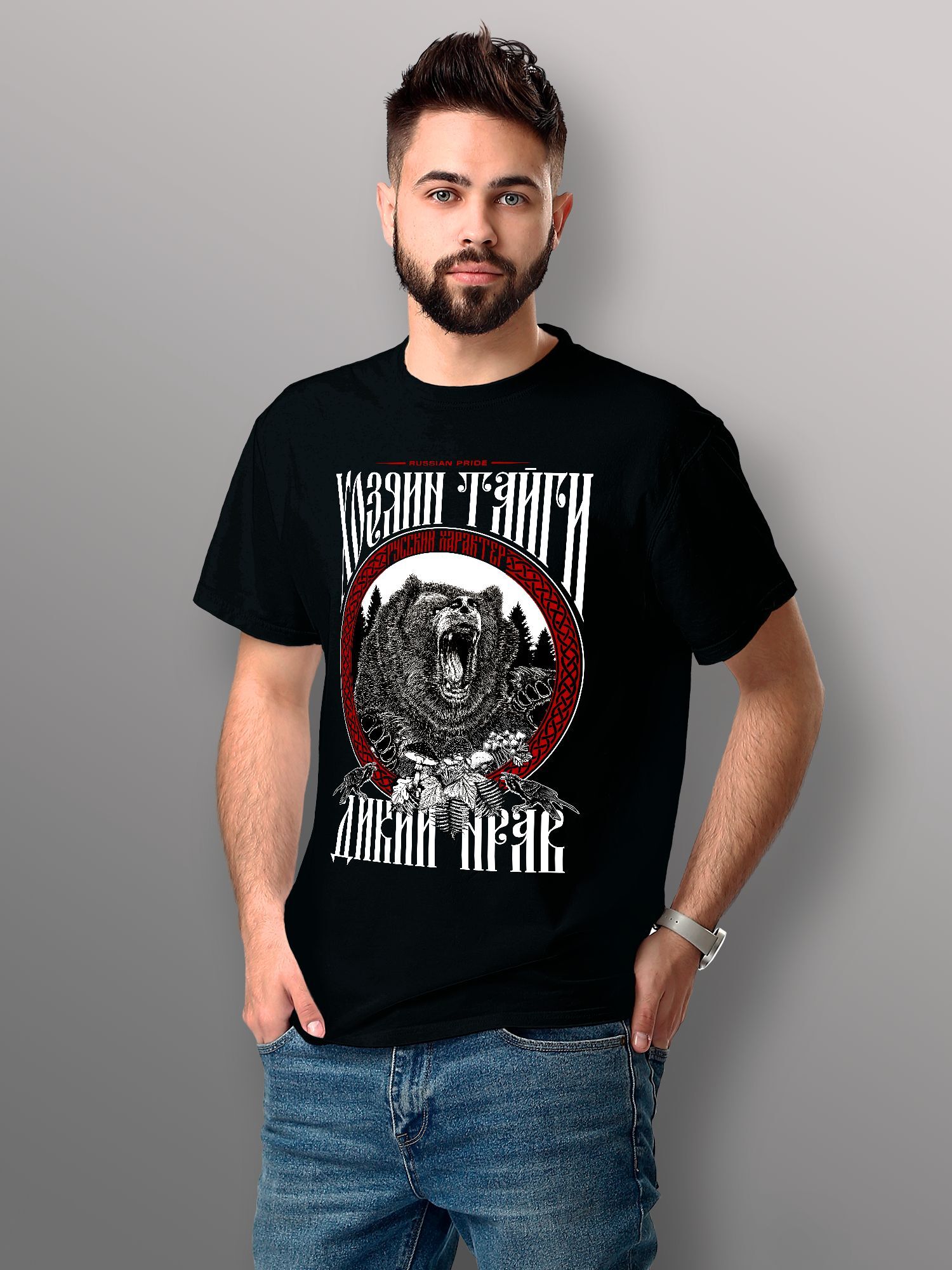 Хлопковая футболка женская с принтом Хозяин Тайги медведь russian pride