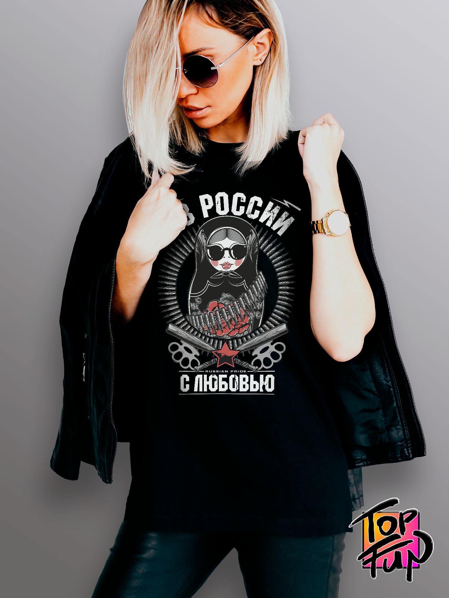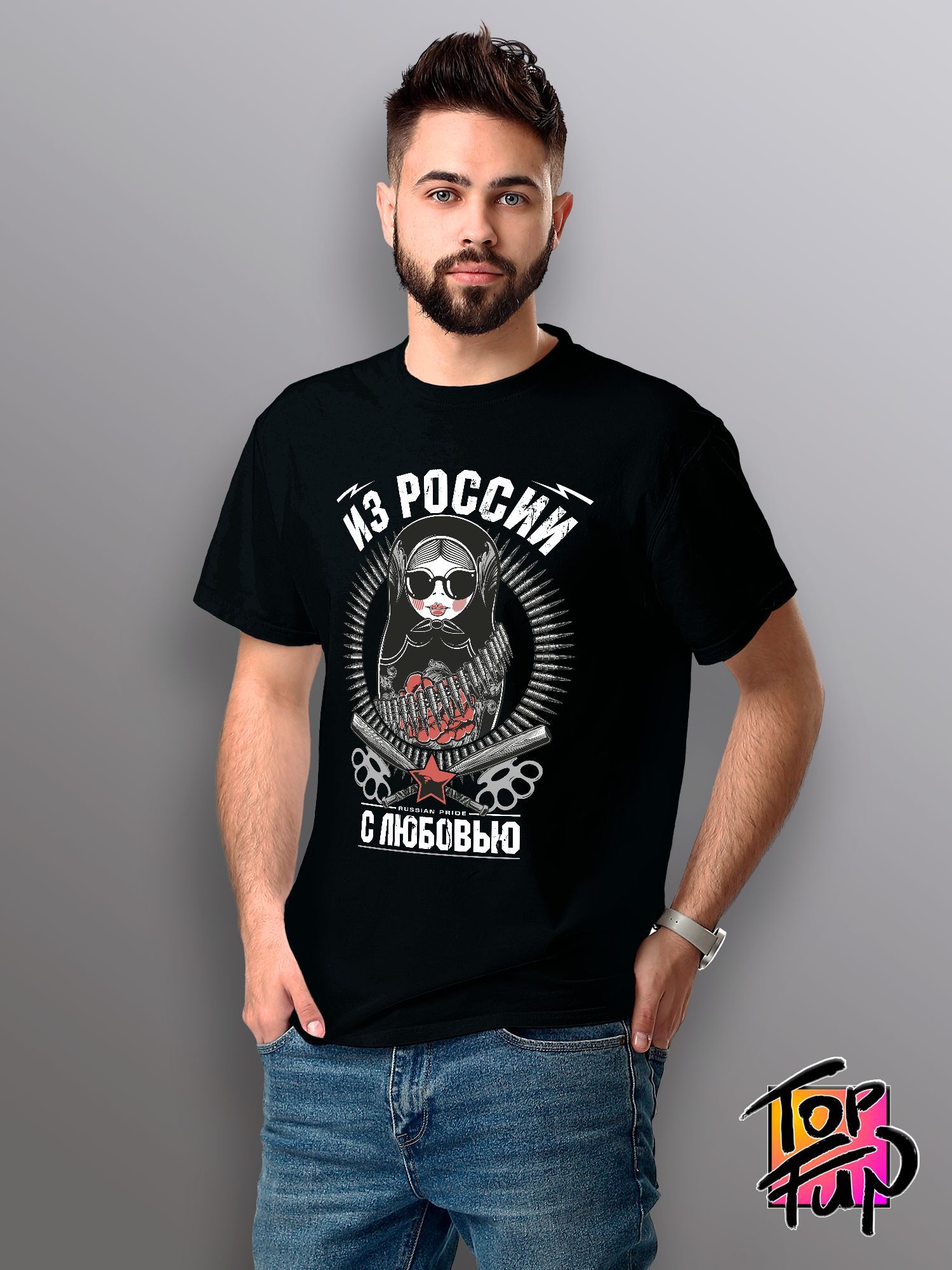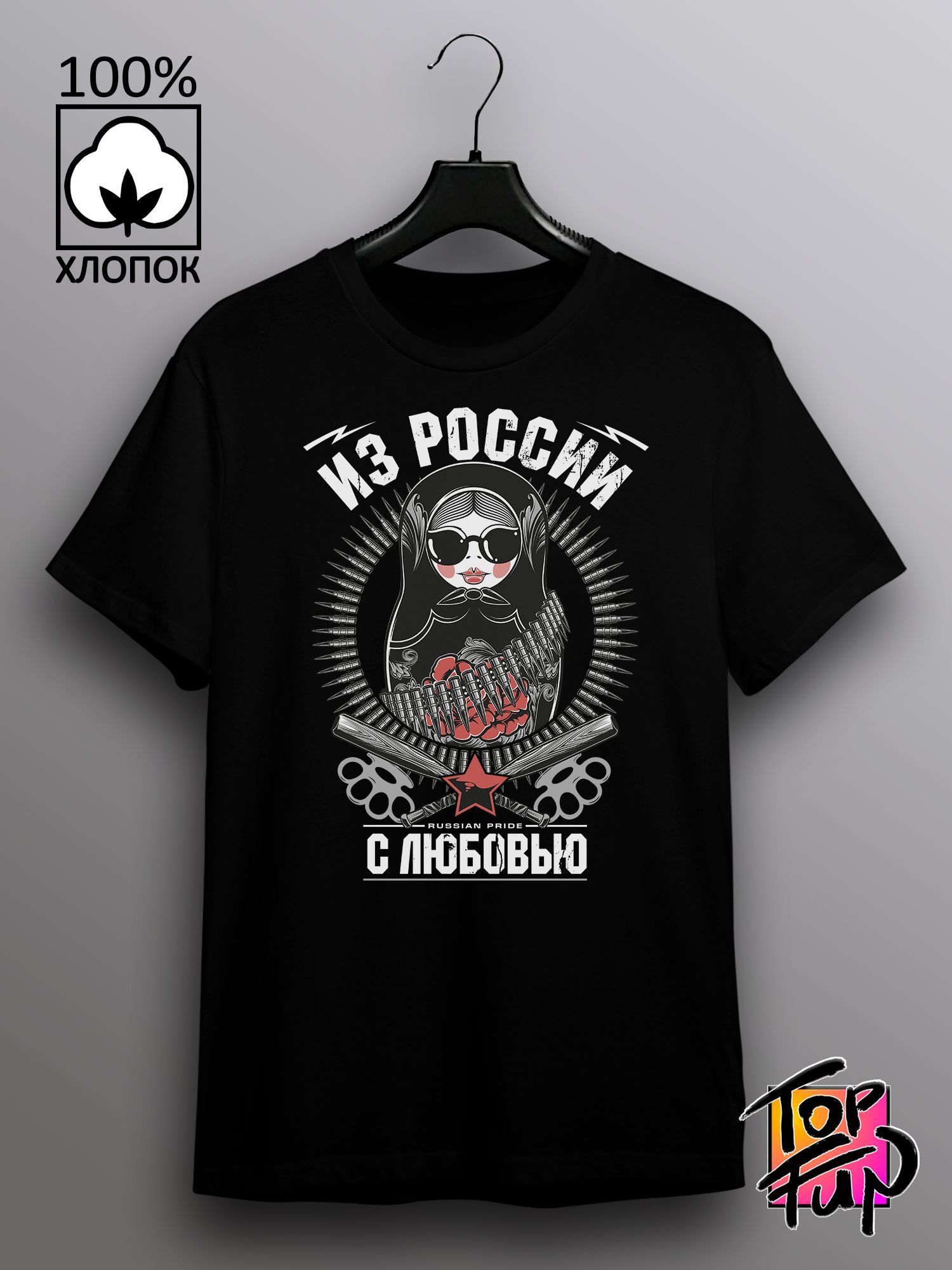 Хлопковая футболка женская с принтом из России с любовью матрешка russian pride