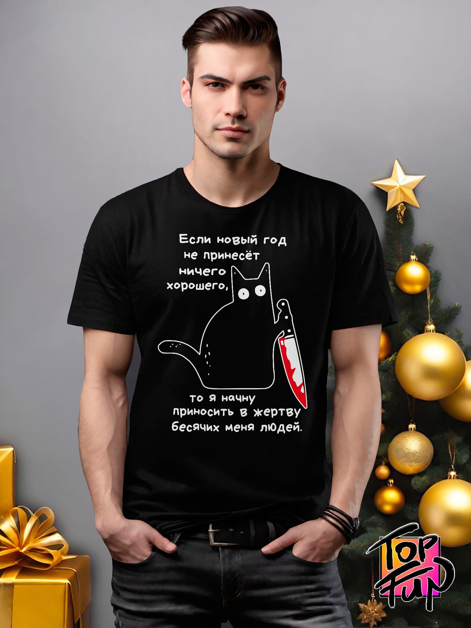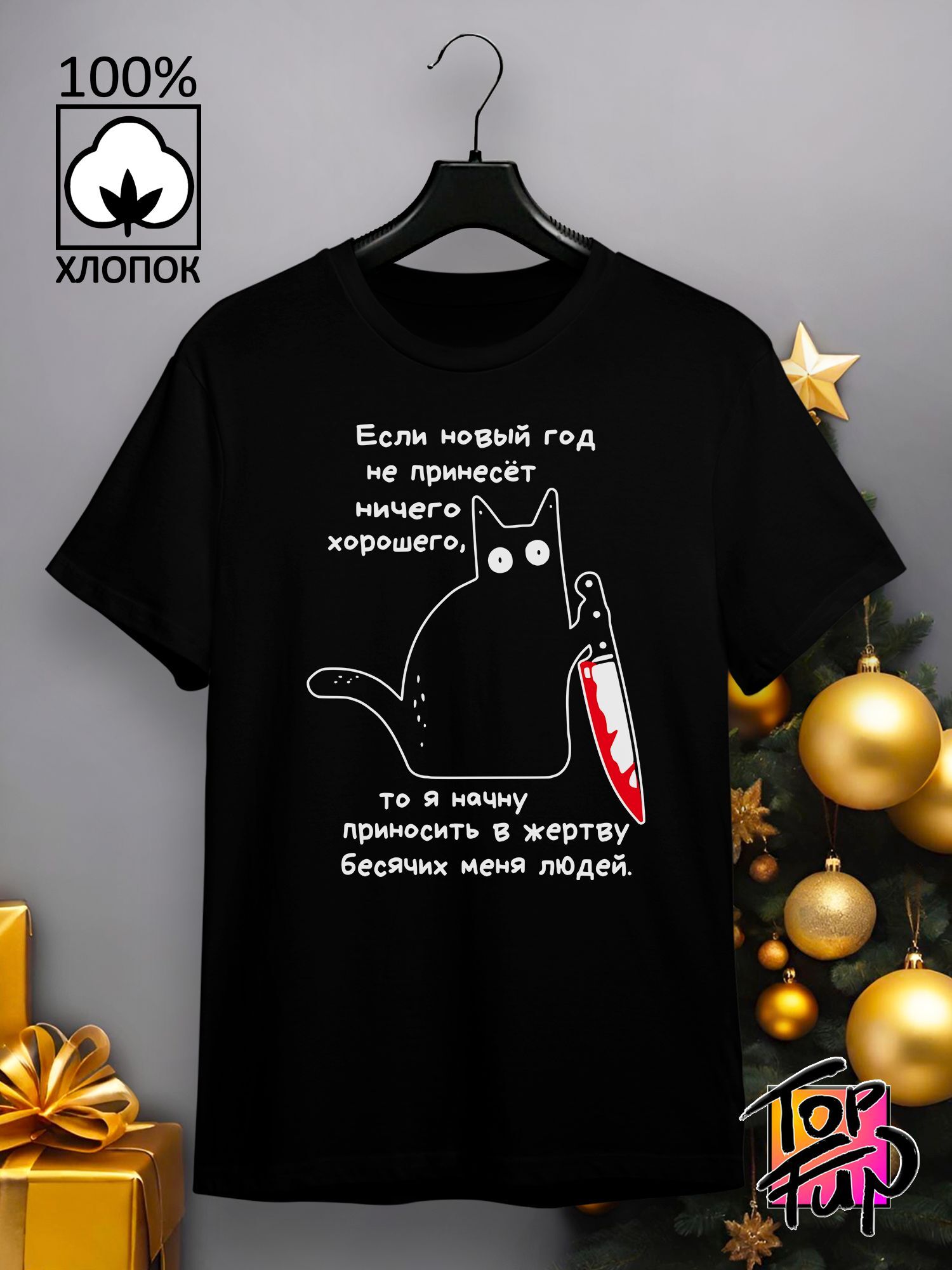 Хлопковая футболка женская новогодняя с принтом Кот с ножом