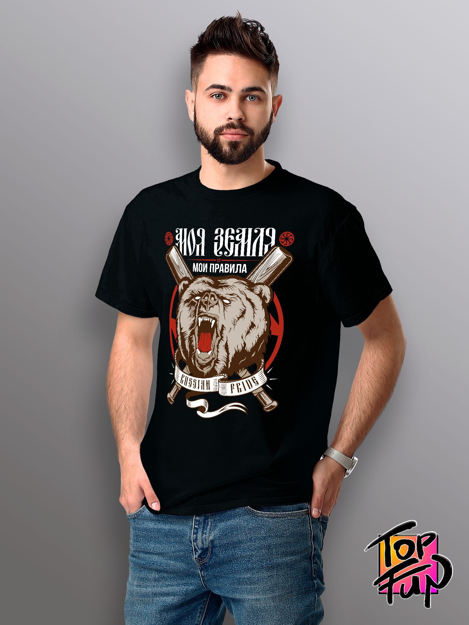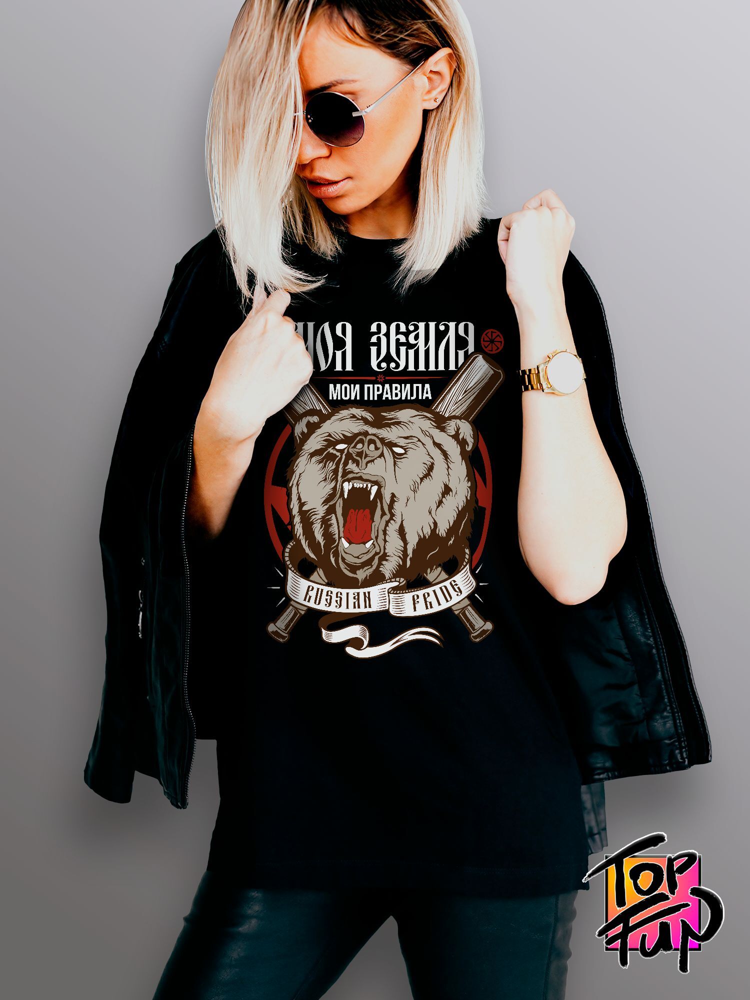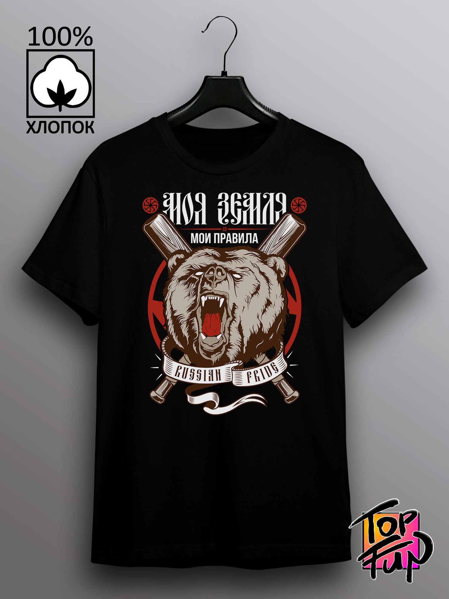 Хлопковая футболка женская с принтом медведь Россия и надписью Моя земля, мои правила russian pride