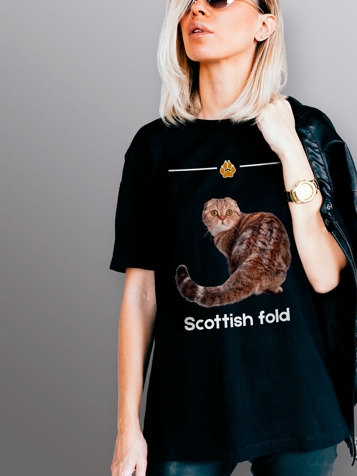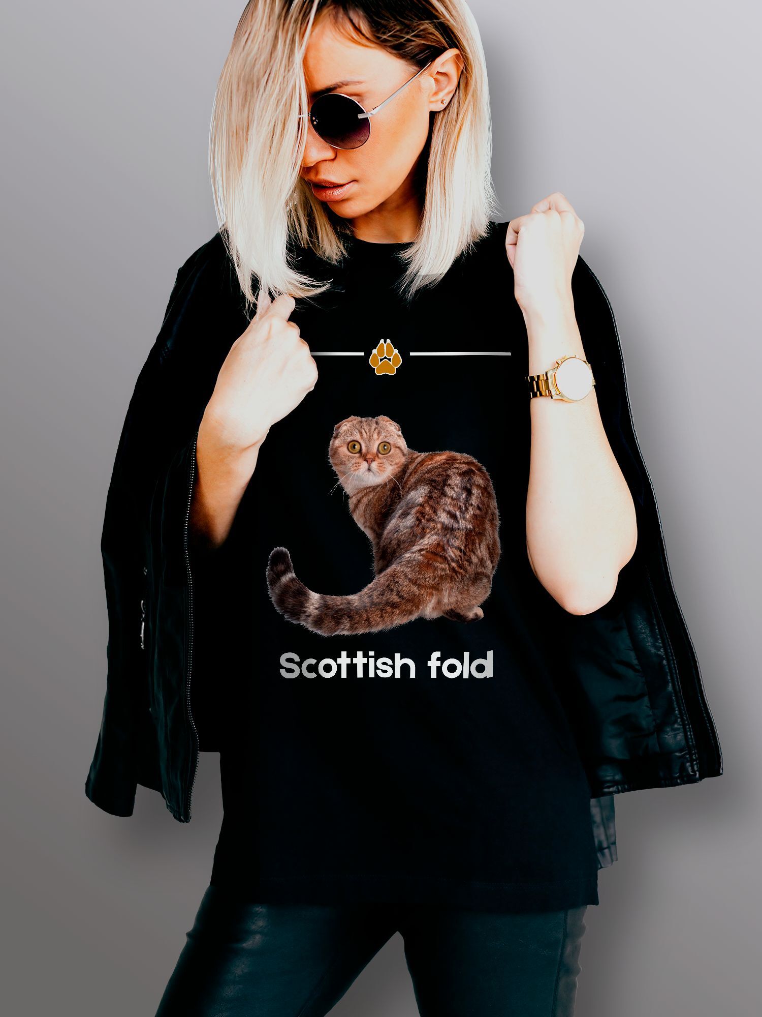 Хлопковая футболка женская с принтом шотландская вислоухая кошка Scottish Fold