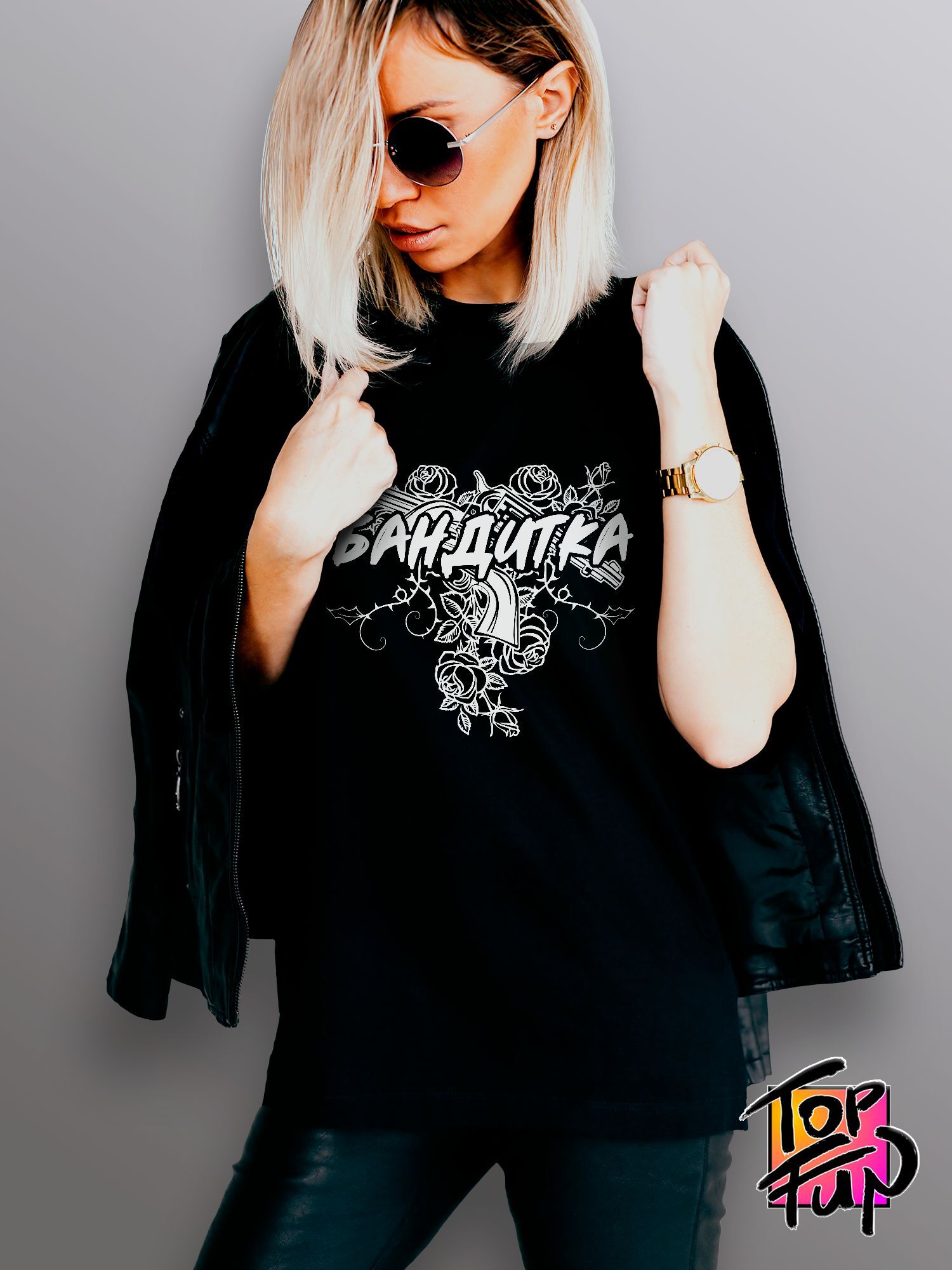Футболка женская с принтом Бандитка с пистолетом